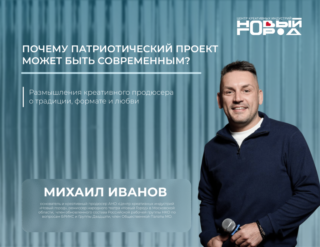 Но мой опыт, а мы в «Новом Городе» создаём проекты уже много лет, убеждает в обратном. Патриотический проект не просто может, он обязан быть современным. Потому что, если мы хотим говорить с сердцами, мы должны говорить на языке сегодняшнего дня. Более того, я убеждён: именно сочетание глубокой, подлинной традиции и острого, актуального формата позволяет проекту стать не просто востребованным, а жизненно необходимым культурным продуктом. Эту формулу мы в Центре креативных индустрий «Новый город» называем просто: «традиция + актуальный формат».